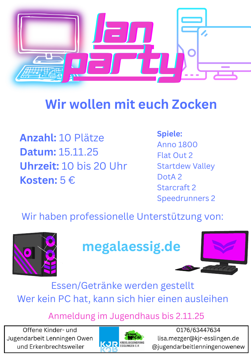 Die Jugend-LAN wird in Zusammenarbeit mit dem Kreisjugendring Esslingen e.V. (Offene Kinder- und Jugendarbeit Lenningen Owen und Erkenbrechtsweiler) veranstaltet und richtet sich gezielt an Jugendliche ab einem Alter von 12 Jahren. Ob erfahrene PC-Gamer, Konsolen-Spieler oder komplette Neueinsteiger – ihr seid alle herzlich willkommen. Weitere Infos findet ihr auf dem Flyer unten. Eine vorige Anmeldung (hier gehts zum Anmeldeformular: Einverständnis LAN-Party) ist Voraussetzung für die Teilnahme. Weitere Infos zum Kreisjugendring/Café Olé findet ihr hier.